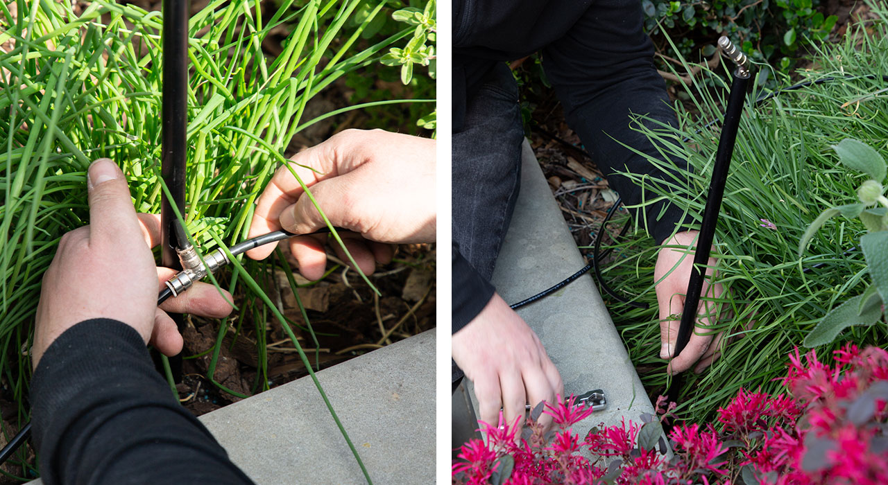 Il tubo in nylon viene steso lungo il perimetro, fissato su siepi, staccionate, muri o, tramite appositi picchetti (riser), a terra. In seguito, si inseriscono gli ugelli a innesto rapido lungo il tubo nei punti previsti. Tutto è studiato per essere il più discreto possibile: le tubazioni seguono linee già esistenti (recinzioni, pareti, vegetazione) e risultano poco visibili.
